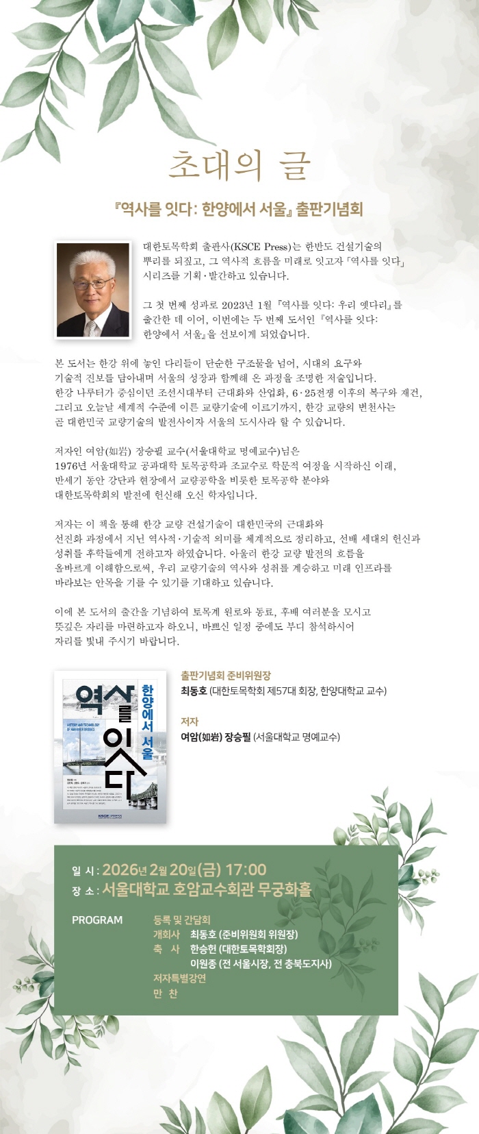 장승필 교수의 『역사를 잇다, 한양에서 서울』 출판기념회에 초대합니다.