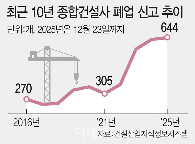 최근 건설경기 악화로 지방·소규모 건설사를 중심으로 폐업이 잇따르고 있다. 종합건설사 폐업은 관련 조사가 시작된 이후 역대 최고치를 찍을 가능성이 높다. ‘건설사 보릿고개’가 이어지며 대형사 위주로 건설업계가 재편될 것이라는 분석도 나온다.